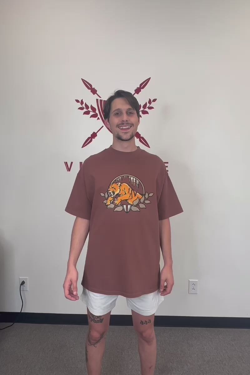 This tee has a luxurious feel and is on the heavier side but roomy and airy for those hotter days. Featuring a portrait in the caverns to discover yourself and your inner strength through the sabertooth tiger, this graphic is inspired by Vicklore's poem, Fortitude of the Soul, found on our blog page.