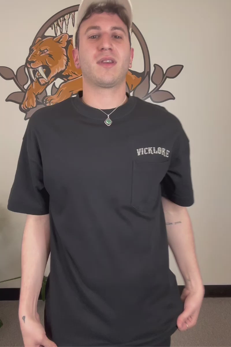 - Vicklore logo in tattoo font printed above pocket